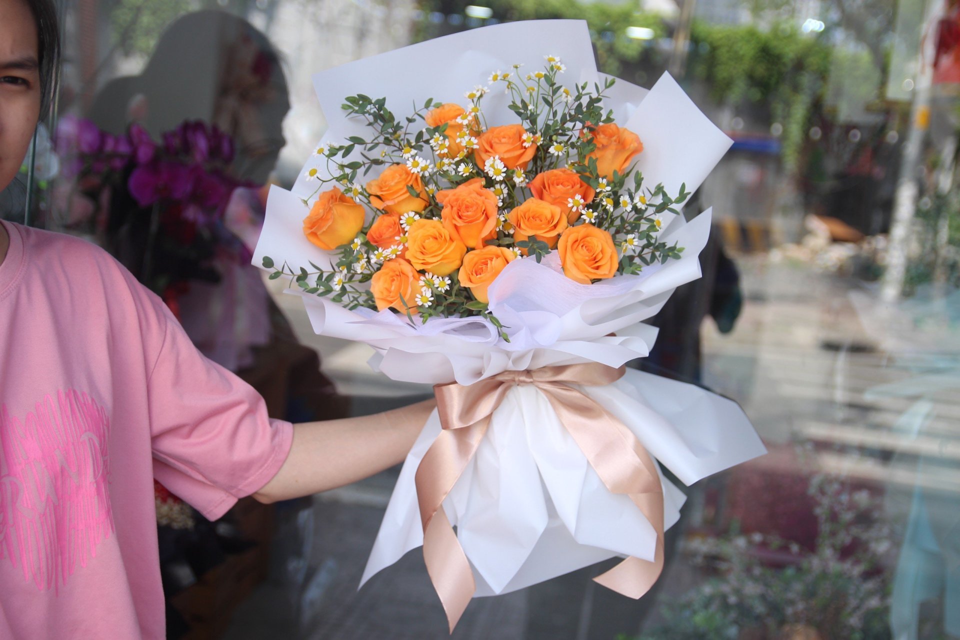 Hoa hồng cam phối giấy trắng đẹp xuất sắc